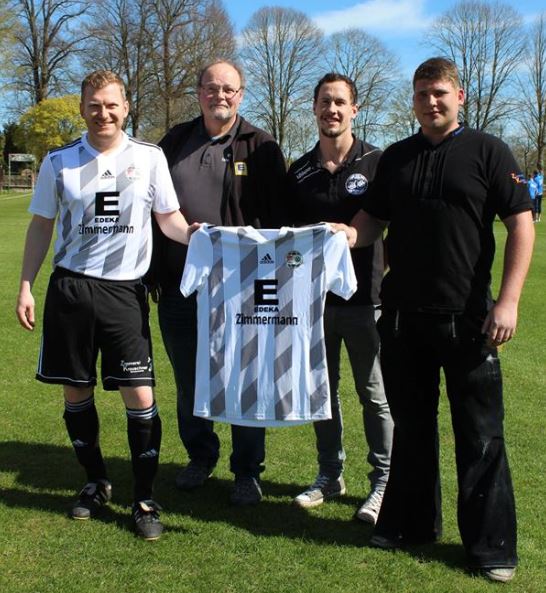 Ralf Zimmermann (EDEKA-Markt Hutzfeld), Hans Reimers & Gregor Mc Dermott (Gasthaus Zum Frohsinn) und Henrik Kreuschner (Zimmerei Kreuschner) für die neuen Trikots. Durch den zweiten Trikotsatz ist unsere Mannschaft nun variabel in der Farbauswahl.